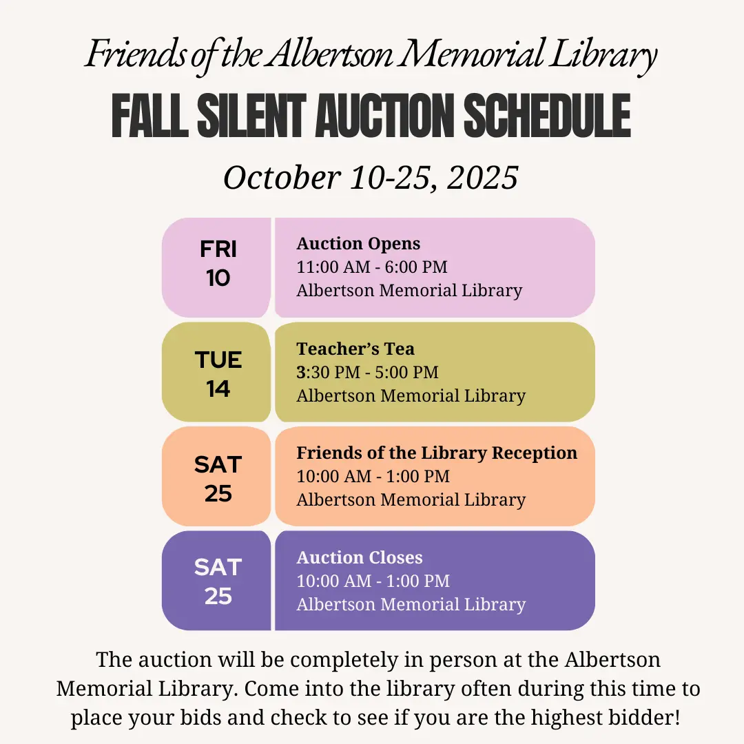 The Friends of the Albertson Memorial Library will be hosting their Annual Fall Silent Auction at the Albertson Memorial Library. This auction will be held completely in person. Items will be displayed and available for bid placement,