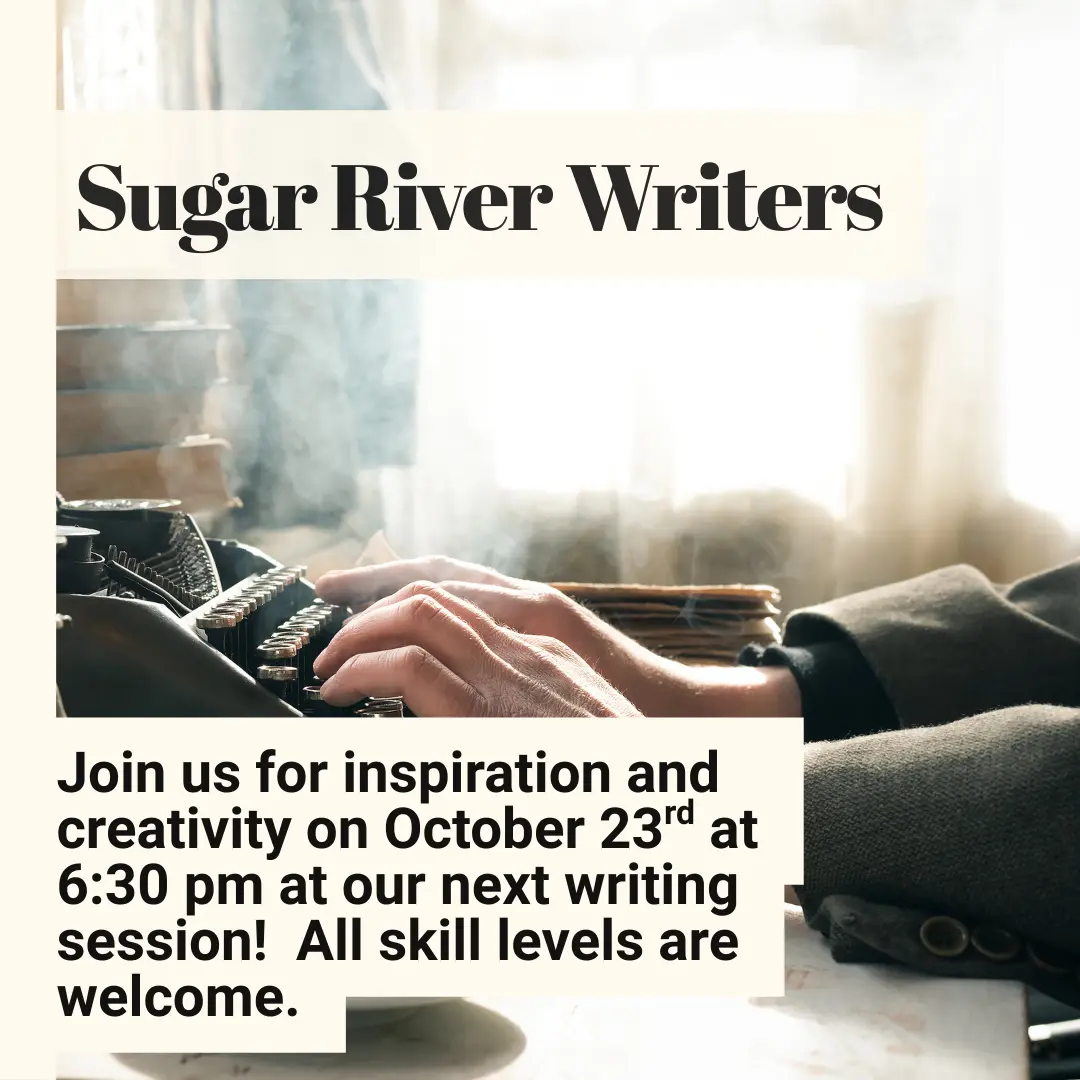 Join the Sugar River Writers for inspiration and creativity on October 23rd at 6:30 pm at our next writing session! All skill levels are welcome.