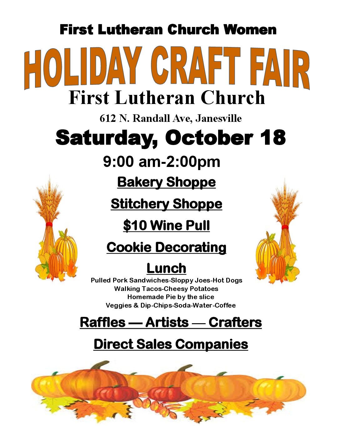 The women of First Lutheran Church are hosting a Holiday Craft Fair on Saturday, October 18 from 9:00am to 2:00pm. The event will feature both crafters and direct sales companies, as well as a bake sale, wine