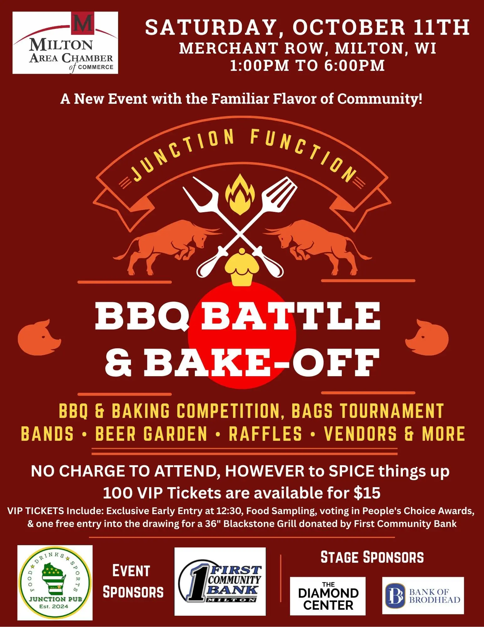 Come on down to Merchant Row in Milton to celebrate the Junction Function! Hosted by the Milton Area Chamber of Commerce. We will have BBQ competition, baking competition, vendors, bands, beer garden and bags tournament and raffles.