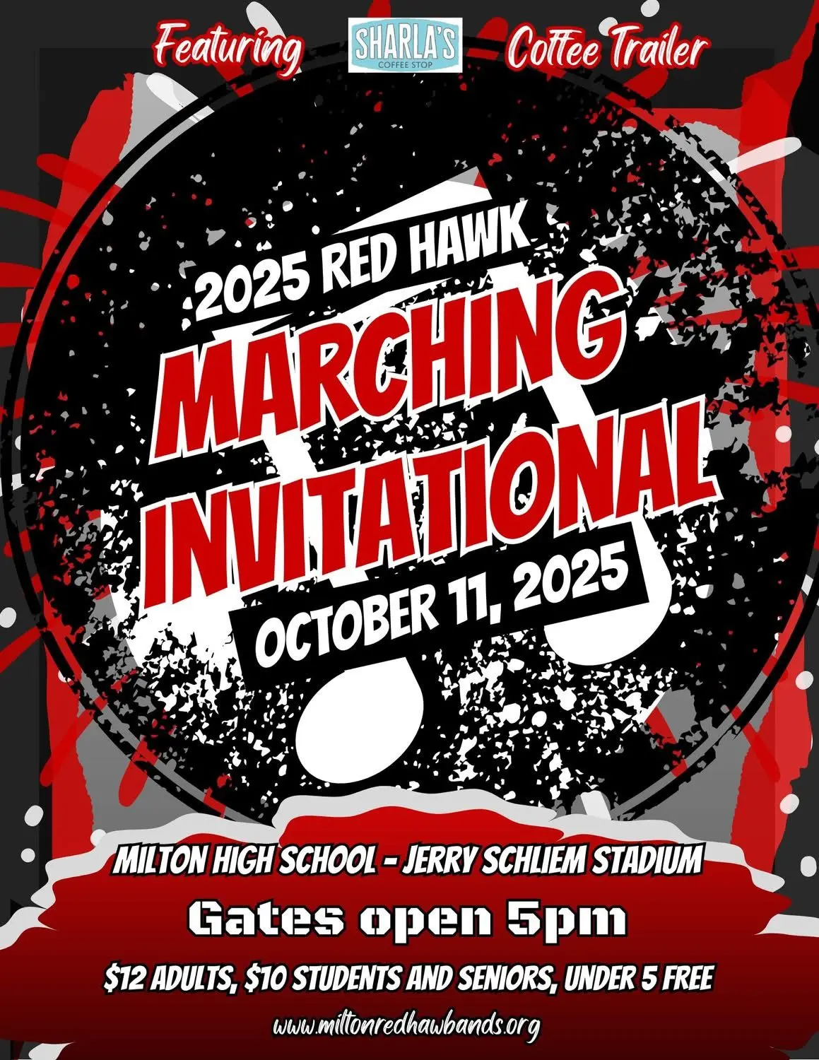 Join us for our annual Milton Red Hawk Marching Invitational! This year we will host 7 bands from around southern Wisconsin showcasing their skills in the marching arts. Concessions and baked goods will be for sale. Sharla's