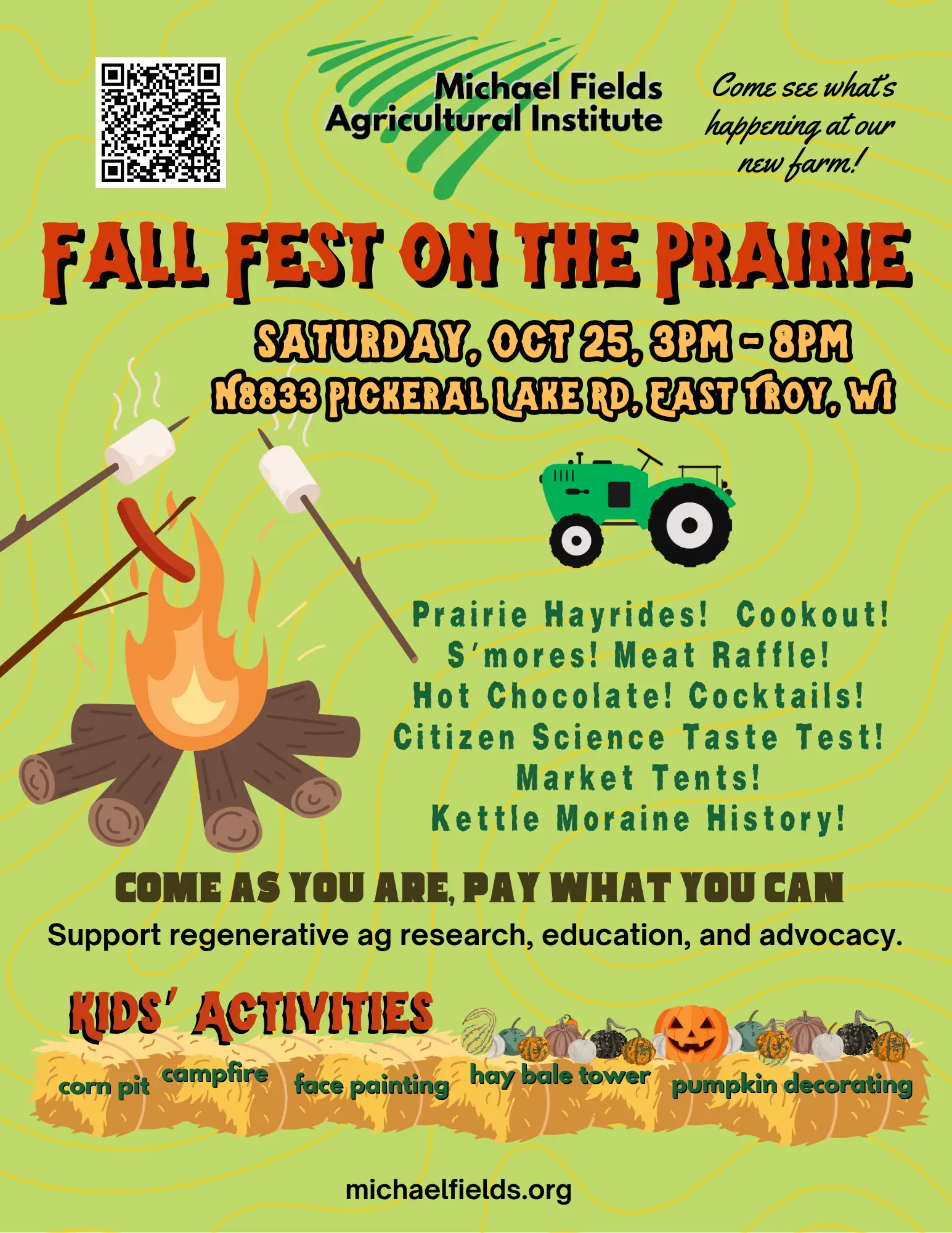 Join Michael Fields Agricultural Institute for an evening of family fun at our new farm! Enjoy kids’ activities, hayride tours, and a cookout dinner featuring local brats, hot dogs, and s’mores. Explore this beautiful location nestled in
