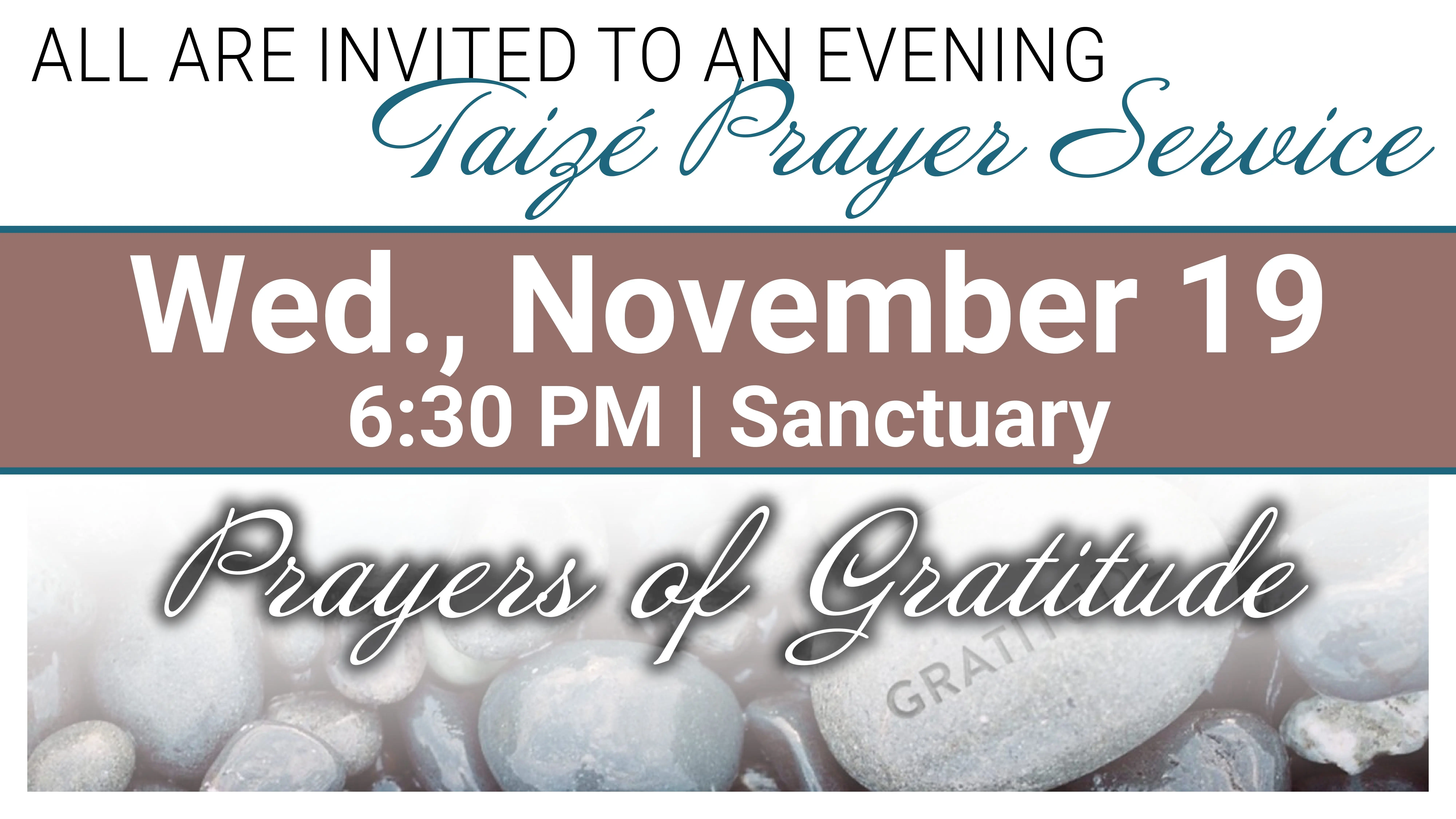 Prayers of Gratitude with special music. Taizé prayer service invites you to worship God through the singing of simple songs, reading of holy scripture & the offering of silent prayers.
