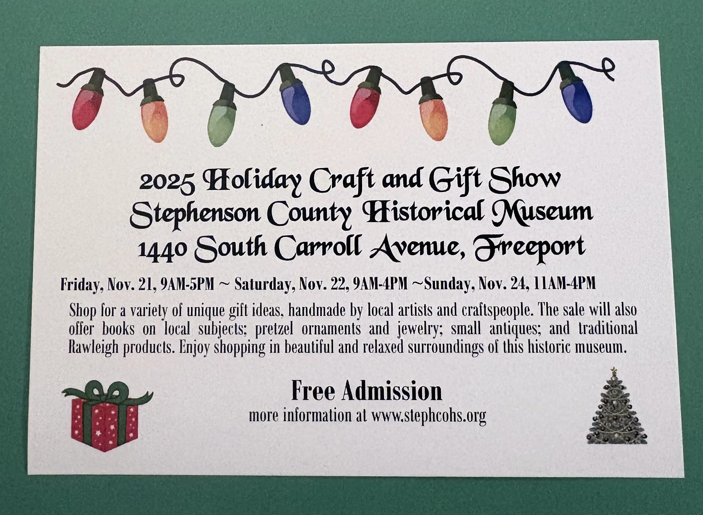 FOR IMMEDIATE RELEASE Stephenson County Historical Society Announces 2025 Holiday Craft and Gift Show Freeport, IL — The Stephenson County Historical Society invites the community to kick off the holiday season at its annual Holiday Craft and