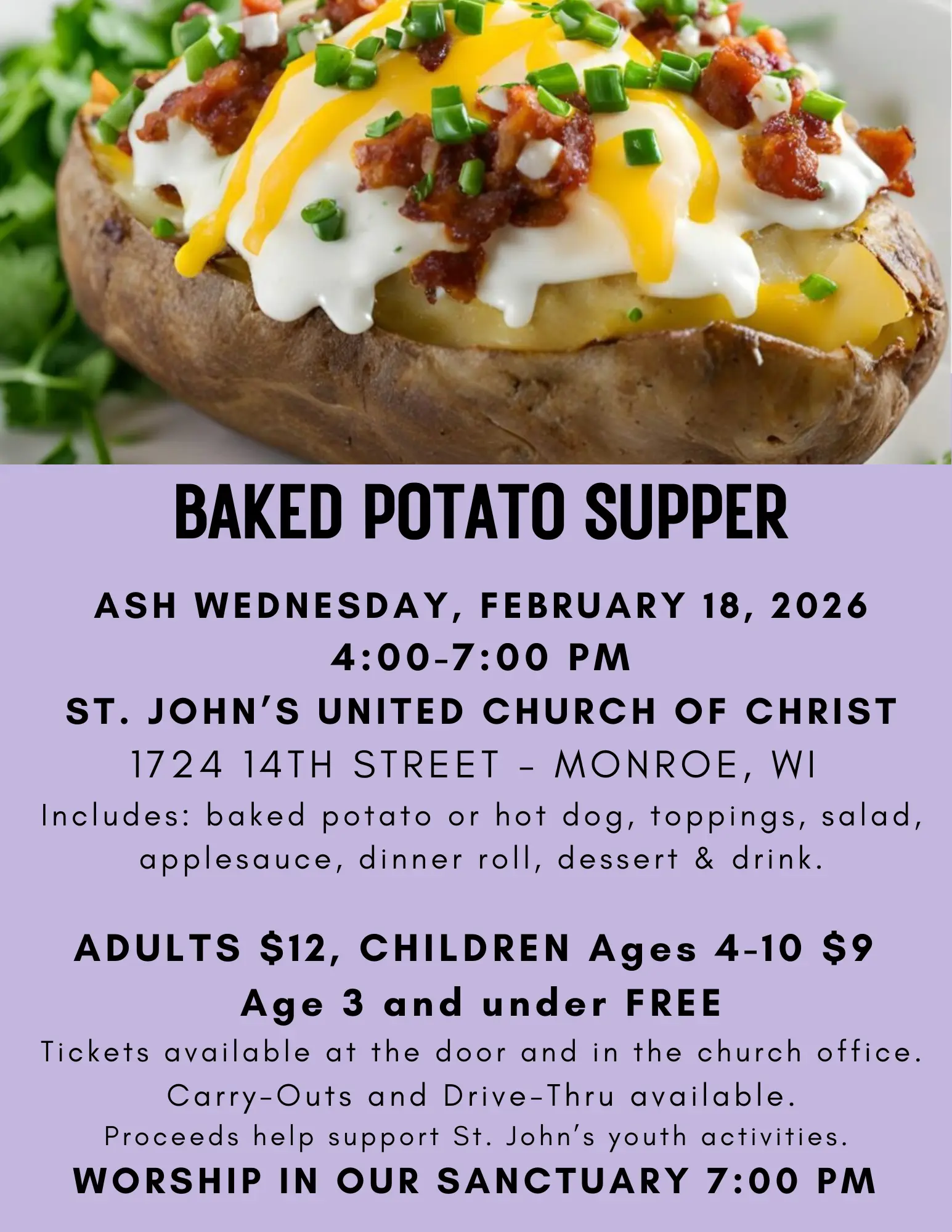 St. John's UCC annual Baked Potato Supper includes baked potato or hot dog, toppings, salad, applesauce, roll dessert and drink. Held at St. John's United Church of Christ Fellowship Hall ~ 1724 -14th St. Monroe, WI. Tickets