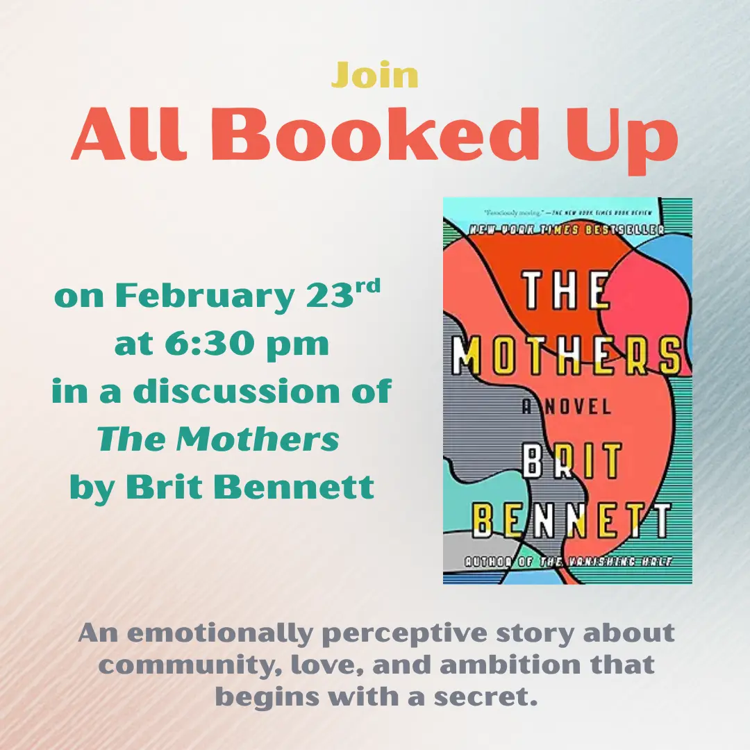 Discuss The Mothers by Brit Bennett with All Booked Up on February 23rd at 6:30 p.m. An emotionally perceptive story about community, love, and ambition that begins with a secret.
