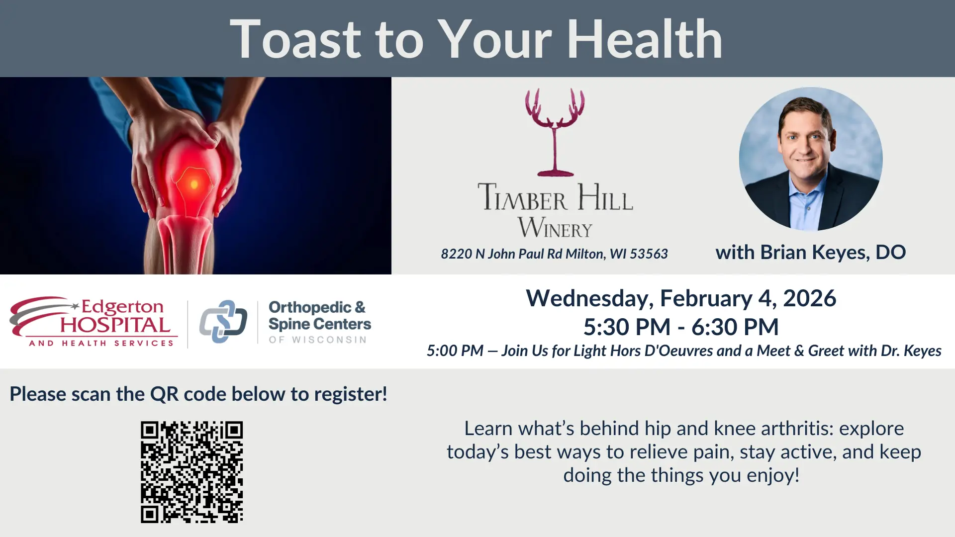 Join us for Toast to Your Health at Timber Hill Winery; a free community event designed to help you learn what’s behind hip and knee arthritis and discover today’s best options for staying active, relieving pain, and