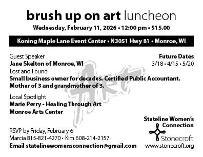 Brush up on Art Luncheon Guest Speaker: Jane Skelton of Monroe, WI Local Spotlight: Marie Perry - Healing Through Art, Monroe Arts Center