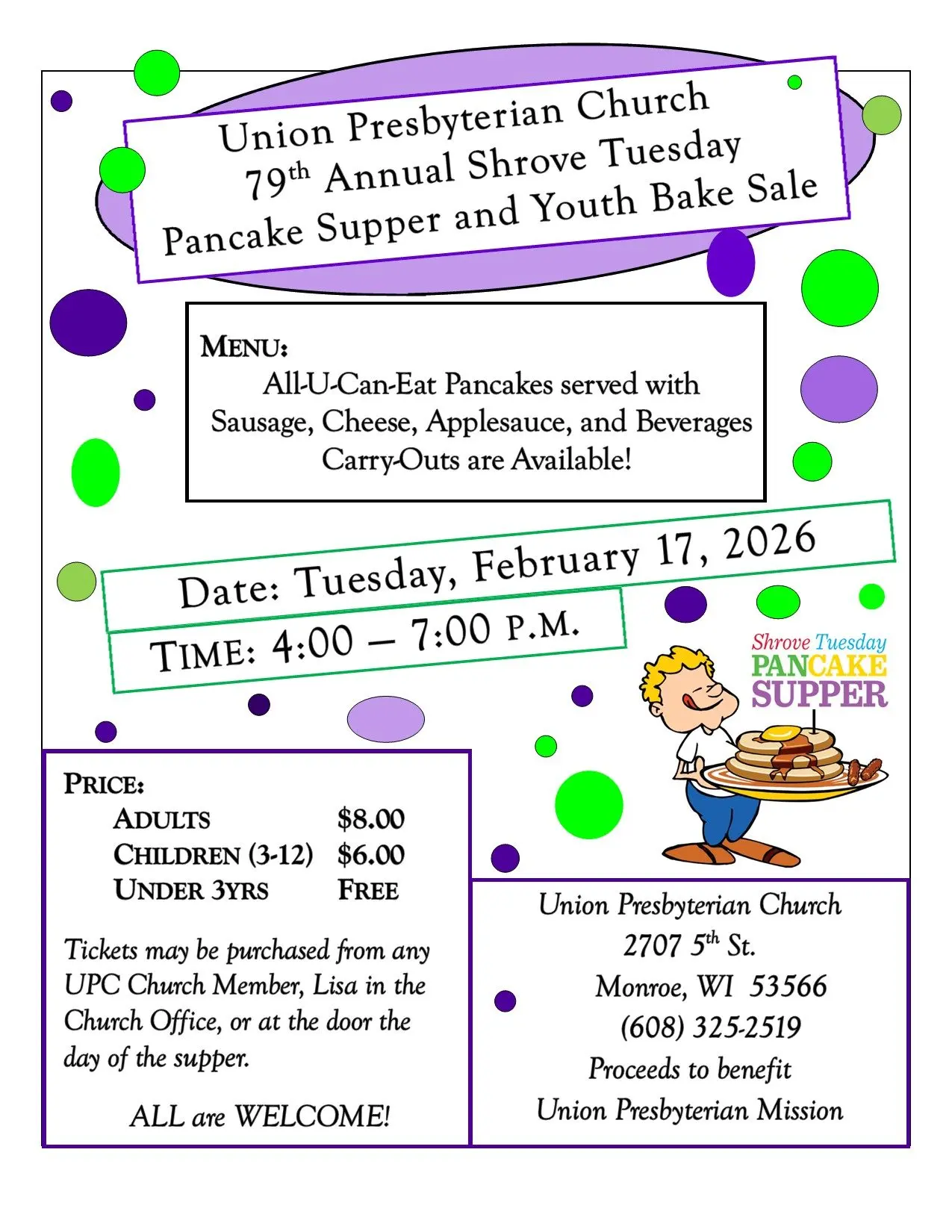 All-U-Can-Eat Pancakes served with sausage, cheese, applesauce and beverages. Carry-outs available. Tickets are $8.00 for adults, $6.00 for children (3-12) under 3 free. Tickets available from any church member, the church office and at the door.