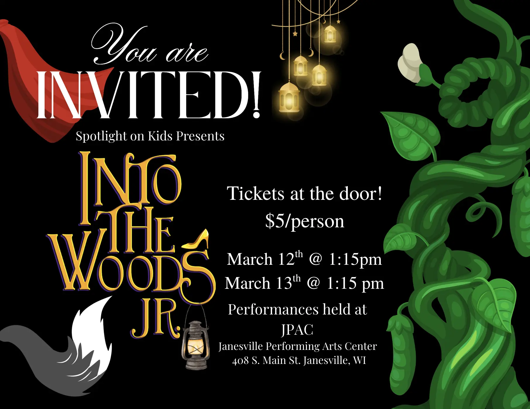 Step into a world of magic, mischief, and music! Spotlight on Kids (SOK) is proud to present Into the Woods Jr., a "cockeyed" fairytale that brings your favorite storybook characters together for a journey like no other.