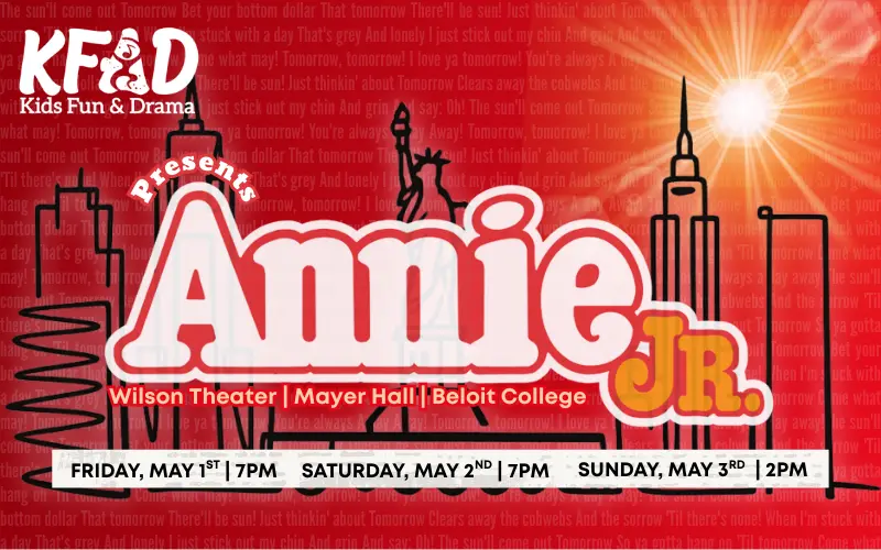 Kids Fun & Drama (KFAD) presents Annie Jr., a youth musical featuring talented young performers from the Stateline area. Performances will be held May 1–3 at the Wilson Theater at Beloit College. Based on the classic story