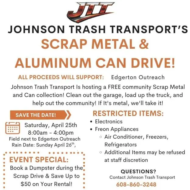 Drop off your scrap metal, aluminum cans, old cords and wires for free. It it's metal, we'll take it! Scrap will be recycled and proceeds will support Edgerton Community Outreach. No electronics, no freon appliances (ACs, freezers,