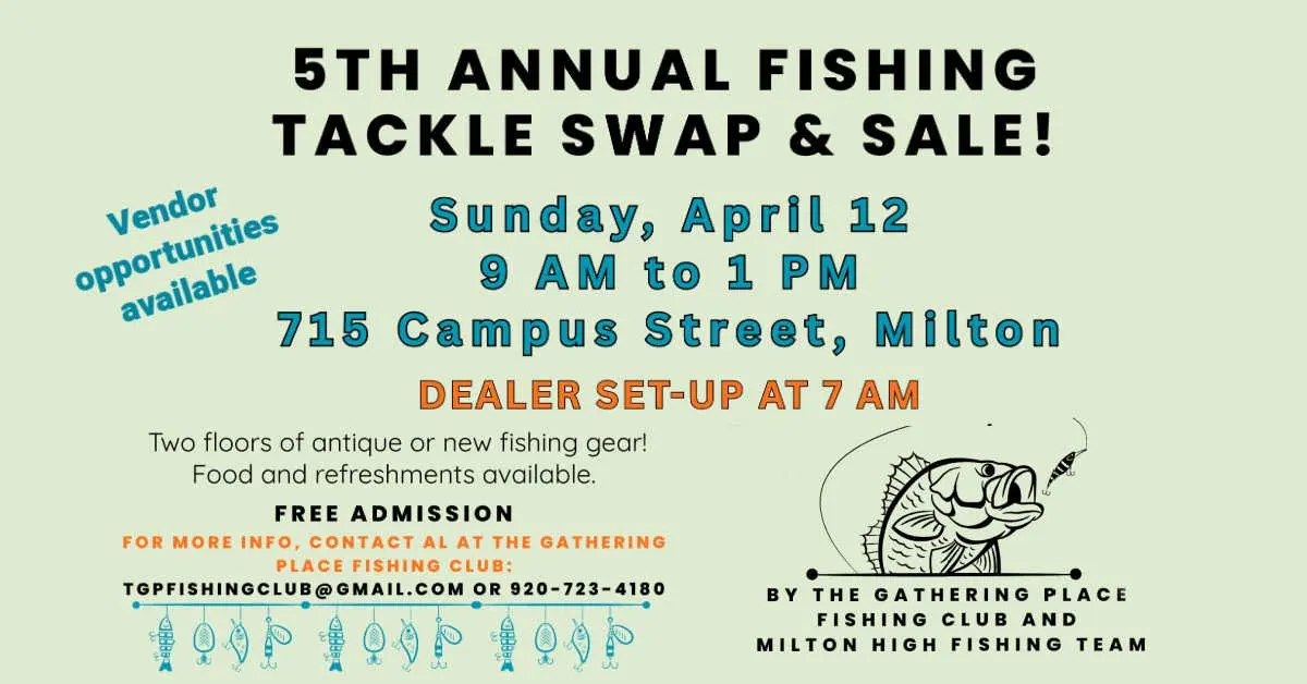 Over 70 tables of new and used fishing tackle and equipment. Concessions available. Sponsored by The Gathering Place Fishing Club and the Milton High School Fishing Team. FREE ADMISSION 9 am - 1 pm The Gathering Place