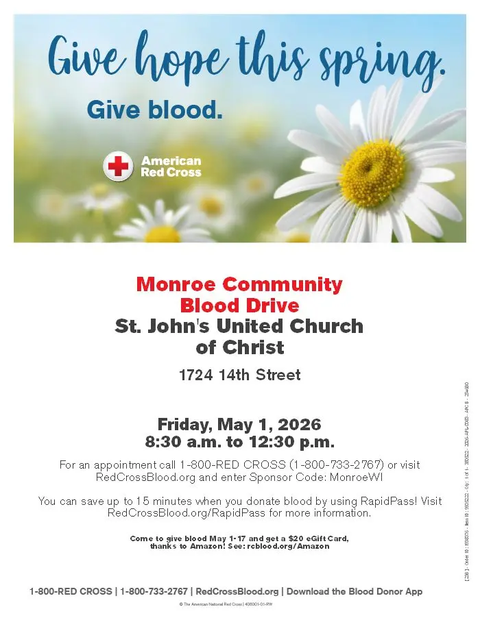 St John's Church will be having a Red Cross Blood Drive on Friday, May 1st from 8:30-12:30. Call 1-800-redcross or go to www.redcrossblood.org with code monroewi to schedule your appointment.