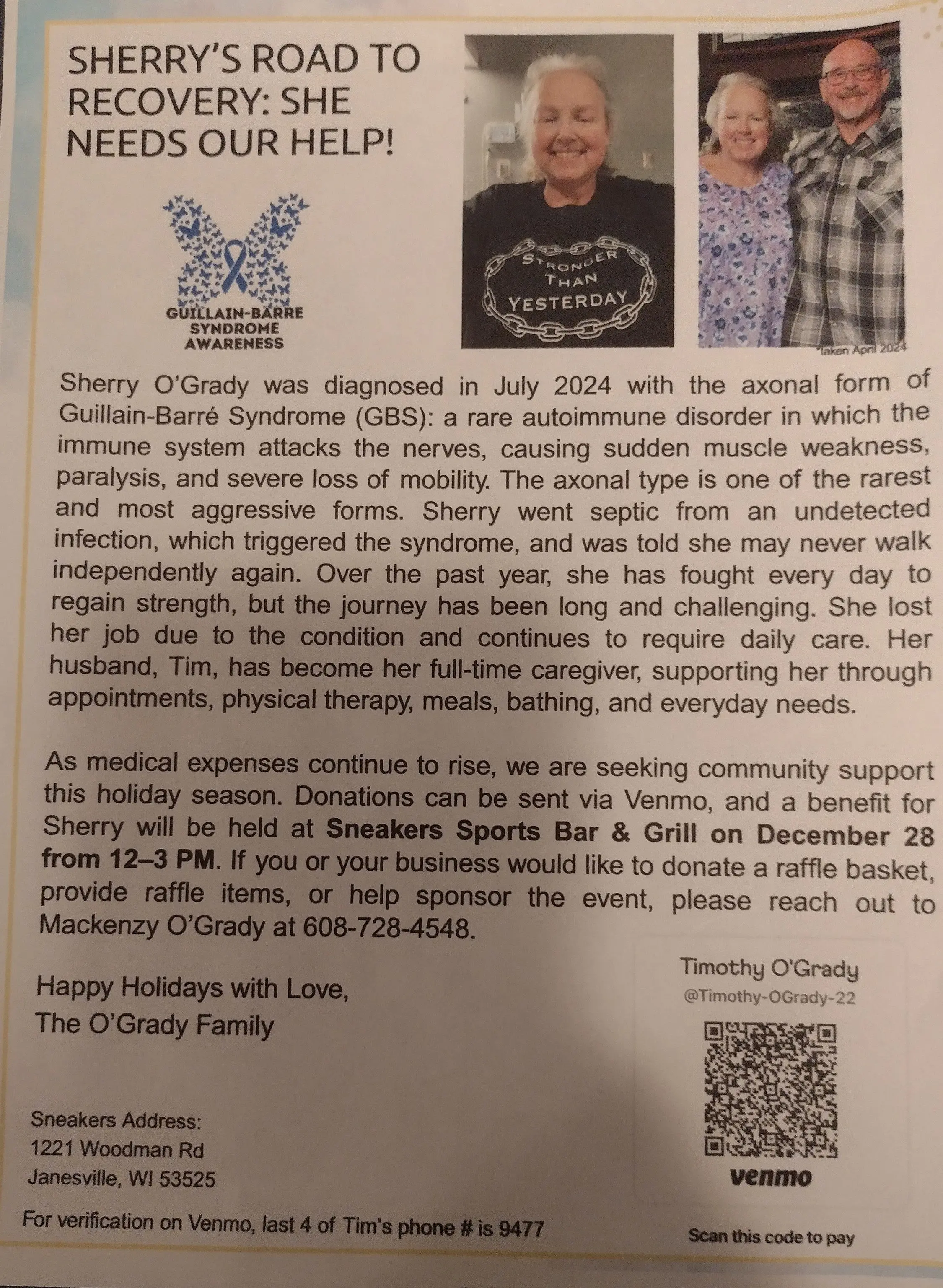 Sherry O'Grady was diagnosed in July 2024 with the axonal form of Guillain-Barre Syndrome (GBS): a rare autoimmune disorder in which the immune the immune system attacks the nerves, causing sudden muscle weakness, paralysis and severe loss